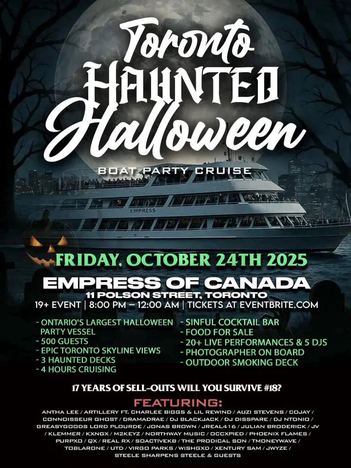 Hosted aboard the legendary Empress of Canada, this Halloween cruise promises to be a night Toronto won’t forget. With 500 guests, 20+ live performances, 5 DJs, and 3 haunted decks, it’s the ultimate fusion of live music, nightlife, and Halloween thrills.